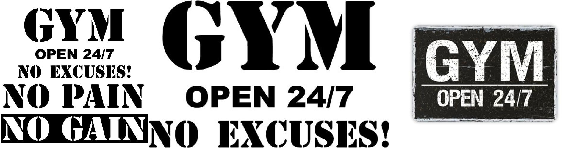 - These are large decals! “Gym Open 24/7 No Excuses” is about 14.1 x 22 inches when finished, and “No Pain No Gain” is about 17.7 x 35.4 inches. You can even DIY the size!