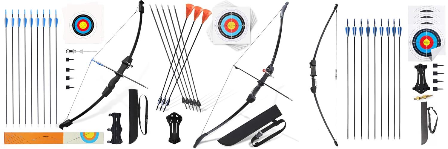 - The kit includes everything you need to get started: a recurve bow, multiple safety arrows (fiberglass and suction cup), target faces, an arm guard, an arrow quiver, a pin sight, and a user manual with helpful shooting tips.