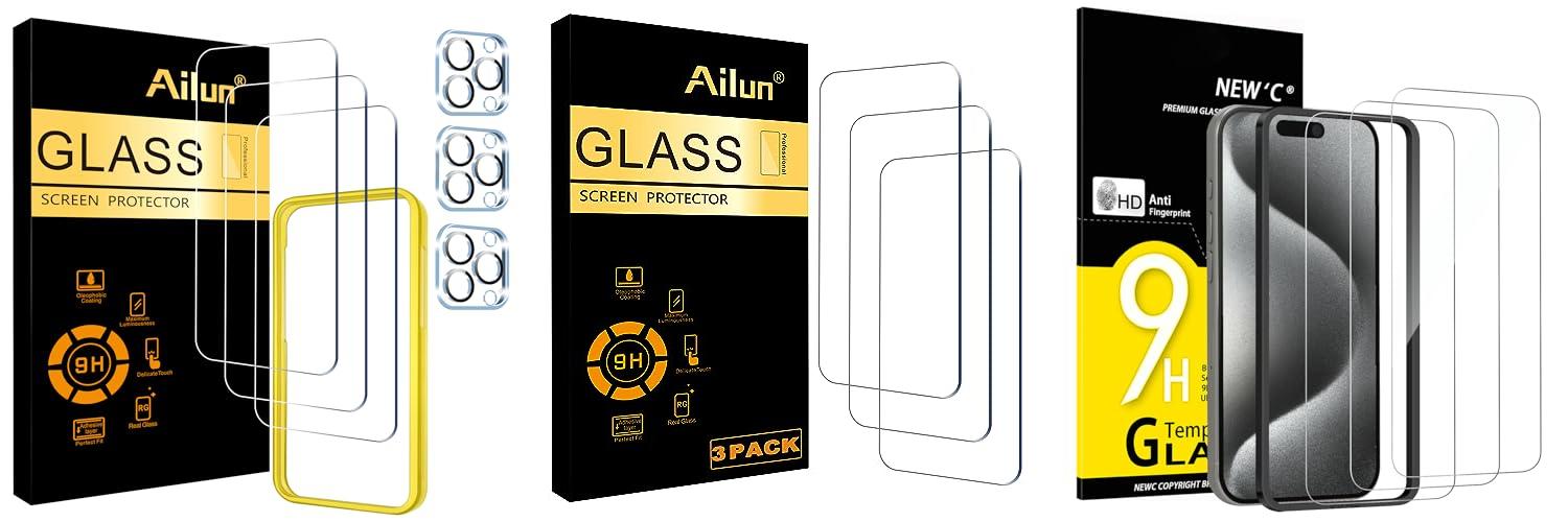 1. Ailun 3 Pack Screen Protector for iPhone 15 Pro [6.1 inch] + 3 Pack Camera Lens Protector with Installation Frame